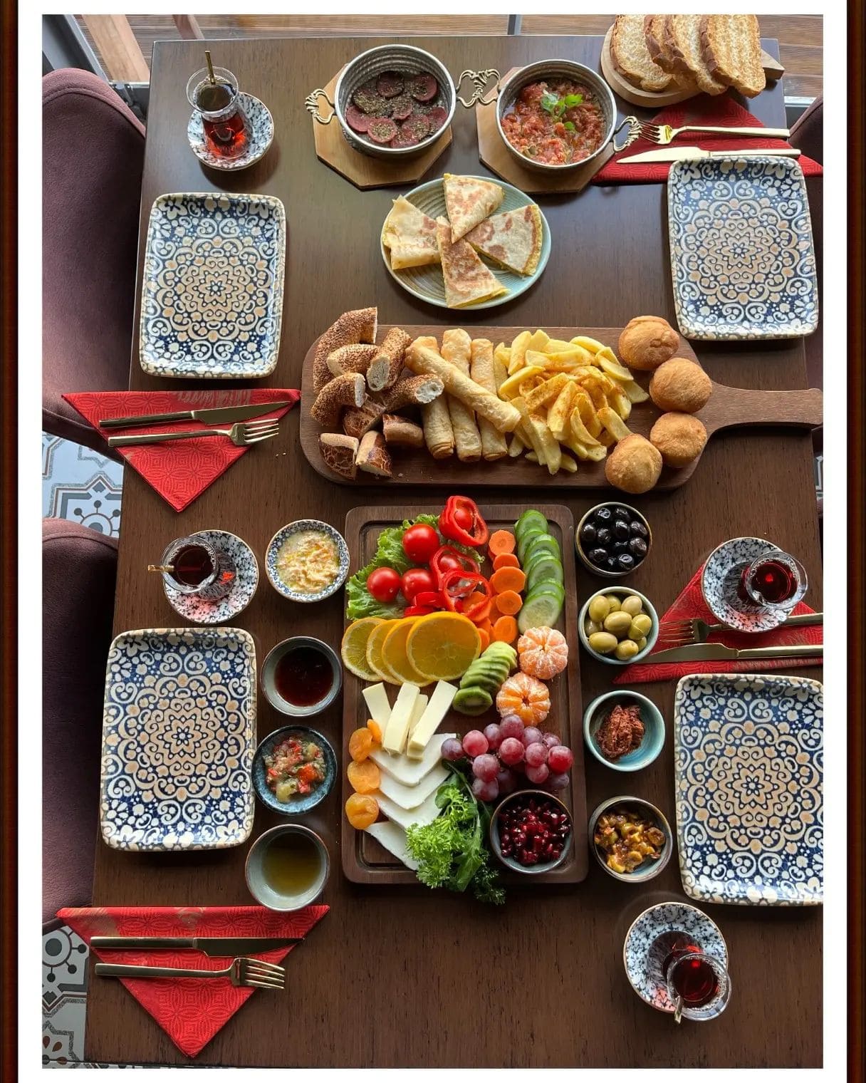 Ezine peyniri, Kaşar peyniri, Kalem Börek, Pişi, Omlet, Patates Kızartması, Menemen, Acuka, Bal, Çikolata,Reçel, Siyah Zeytin, Yeşil Zeytin, Mevsim meyveleri, Mevsim yeşillikleri, Mevsime göre Havuç tarator, Kırmızı biber kızartması ve Yoğurtlu Semiz otu servis edilmektedir.